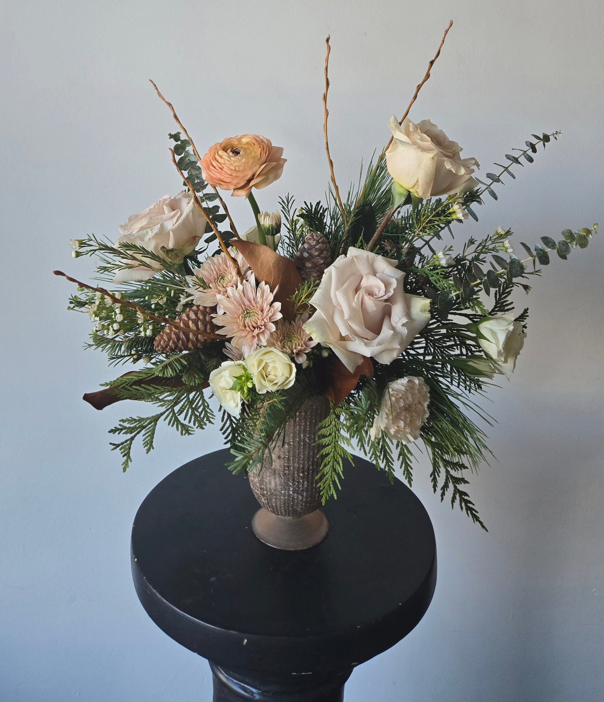 Elevate your dinner gatherings with our elegant floral arrangements, designed in a classic footed vase. Perfect for gifting or styling your own table. Bring warmth and beauty to any family-style meal. Purchase two to create a stunning pair for your sideboard or buffet, adding balance and charm to your evening of entertaining.