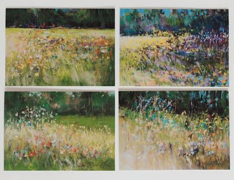 Gift set of four cards - assorted designs. Art by Rosalie Olson, a contemporary Canadian artist recognized for her expressive marks, harmonious colors, and sense of light. This collection is called Fields of Wonder 2025