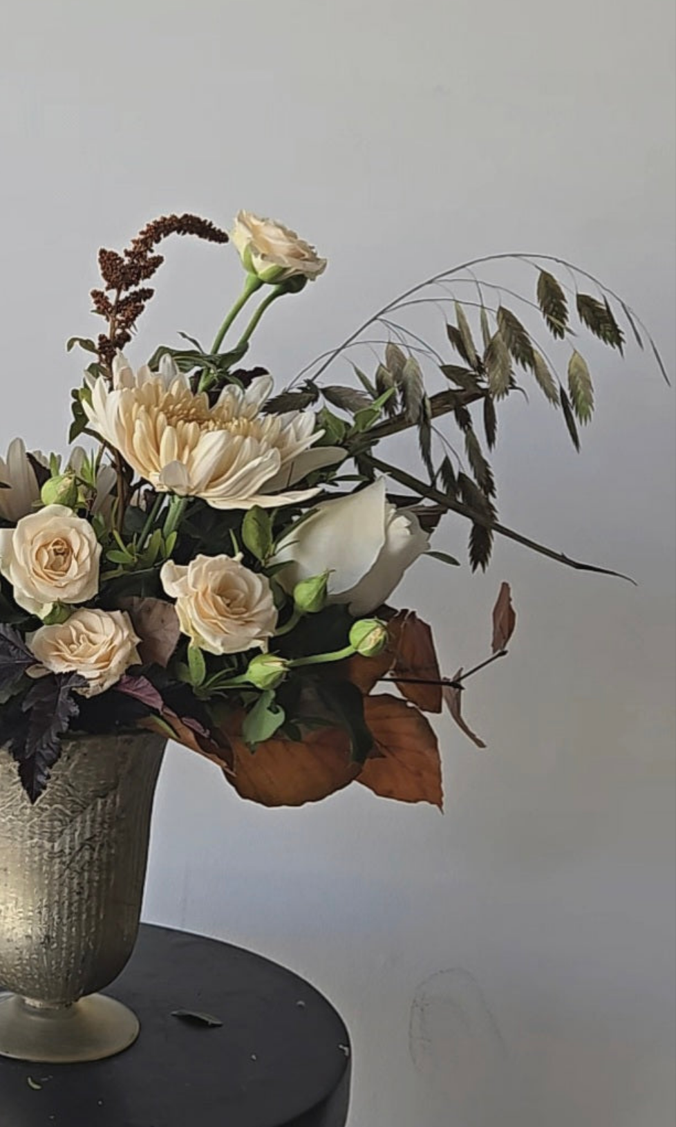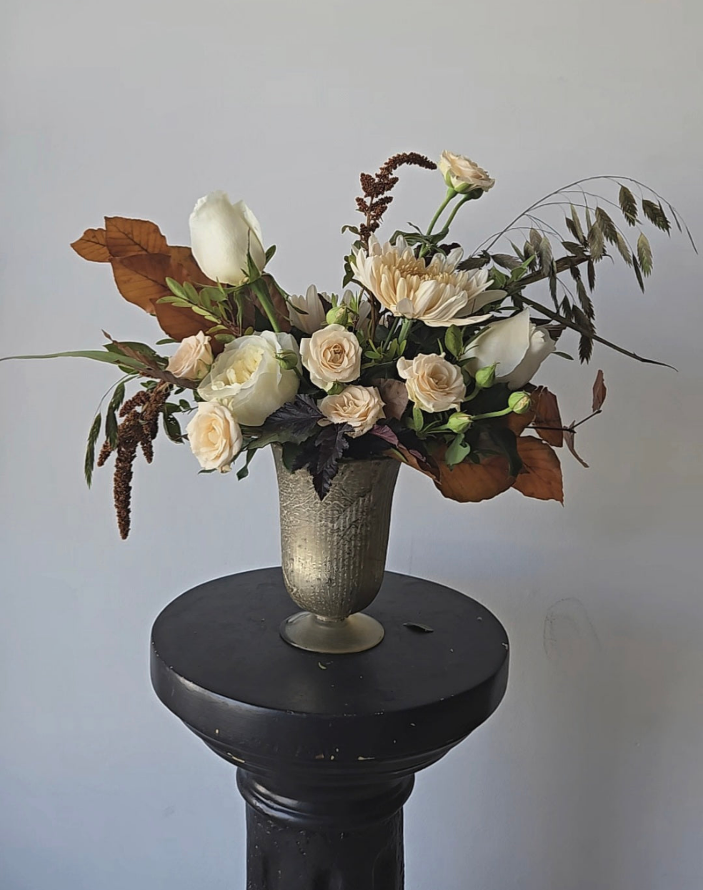 Elevate your dinner gatherings with our elegant floral arrangements, designed in a classic footed vase. Perfect for gifting or styling your own table. Bring warmth and beauty to any family-style meal. Purchase two to create a stunning pair for your sideboard or buffet, adding balance and charm to your evening of entertaining.